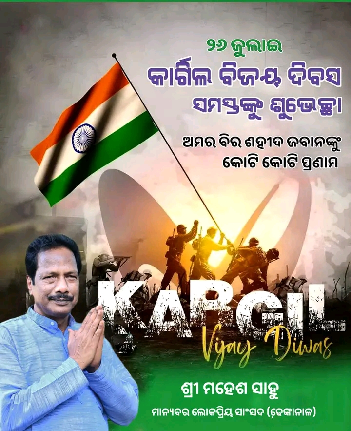 “କାରଗିଲ ବିଜୟ ଦିବସ” ର ୨୪ତମ ବର୍ଷ ପୂର୍ତ୍ତି ଅବସରରେ “ଅପରେସନ ବିଜୟ” ରେ ଭାରତ ମାତାର ବୀରପୁତ୍ର ଯେଉଁମାନେ ଦେଶ ମାତୃକା ପାଇଁ ସର୍ବୋଚ୍ଚ ବଳିଦାନ ଦେଇଥିଲେ ସେମାନଙ୍କୁ ସ୍ମରଣ କରି ମୋର ହୃଦୟର ଗଭୀର ପ୍ରଦେଶରୁ ଭକ୍ତିପୂତ ଶ୍ରଦ୍ଧାଞ୍ଜଳି ଜ୍ଞାପନ କରୁଛି। ଶ୍ରୀ Mahesh Sahoo ମାନ୍ୟବର ଲୋକପ୍ରିୟ ସାଂସଦ ଢେ଼ଙ୍କାନାଳ.#KargilVijayDiwas #OperationVijay#JaiHind