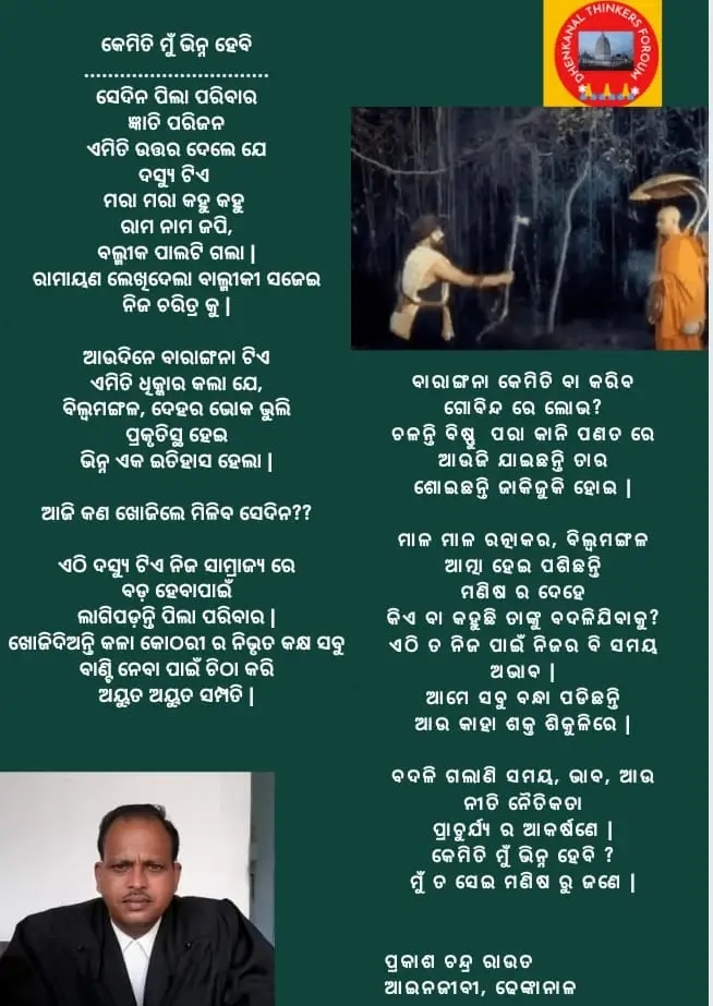କାମନାର ଆକର୍ଷଣ—————–ବାରବାର ଜୁଆର ମାଡ଼ରେମିଳେଇ ଗଲାଣିପାହାଡ଼ଭଳି ସଶକ୍ତପିଣ୍ଡ ସମୁଦ୍ର ତଟରସମୁଦ୍ରର ଜଳ ଆଉ କୂଳ ଏକାଦିନେ ଜନ୍ମଯେମିତିଦୁଃଖ ଆଉ ମଣିଷତଥାପି….ଜଣେ ଆରଜଣକୁ ଅହରହ ଗିଳୁଥାଏକାଳ ସହ ତାଳଦେଇସତରେ…..ପ୍ରକୃତିର ବିଚିତ୍ର ନିର୍ଯାସ ପୂର୍ଣ୍ଣିମା, ଅମାବାସ୍ୟା ଭଳି ନିର୍ଦ୍ଦିଷ୍ଟ ତିଥିରେଫୁଲିଉଠେ ସମୁଦ୍ର କୂଳ ଲଙ୍ଘିବାକୁମାସର ପହିଲି ହପ୍ତାଟି ଯେମିତିଛକି ବସିଥାଏତ୍ରସ୍ତଅଥଚ ଅଭାବୀ ମଣିଷର ଆତ୍ମା ଦହିବାକୁବାଃ ଇଏ କି ସଂଯୋଗଜୀବନ ବର୍ଣ୍ଣବୋଧର ଚିରାପୃଷ୍ଠା ସହକ୍ରମଶଃ କ୍ଷୀଣ ସେହିସମୁଦ୍ରର କୂଳକେମିତି ସହୁଛି ଦେଖଏକା ପରାଭବକାହିଁକି ଏ ଦୁଃଖ?ସବୁ ଖାଲି କାମନାର ଆକର୍ଷଣ ନୁଁହେତ ଆଉ କଣ ?+++ପ୍ରକାଶ +++