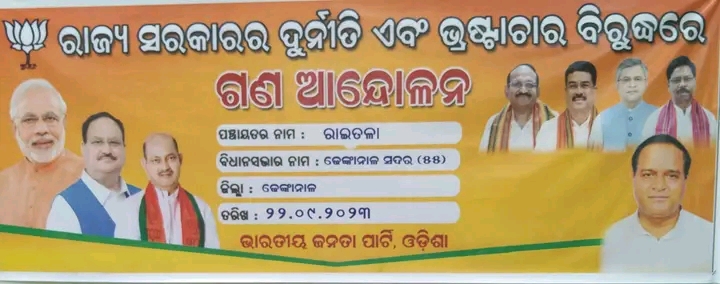ରାଜ୍ୟ ବିଜେପି ସଭାପତି Manmohan Samal ଜିଙ୍କ ଆହ୍ୱାନ କ୍ରମେ ଓଡ଼ିଶାର ପ୍ରତି ଗ୍ରାମ ପଞ୍ଚାୟତ ସମ୍ମୁଖରେ ଓଡ଼ିଶାର ବିଜେଡି ସରକାରର ଦୁର୍ନୀତି ଅନୀତି ଏକଛତ୍ରବାଦ ଭ୍ରଷ୍ଟାଚାର ବିରୁଦ୍ଧରେ ଗଣବିକ୍ଷୋଭ ରାଜ୍ୟାବ୍ୟାପୀ ଚାଲୁ ଅଛି, ସେଇ କ୍ରମରେ ଆଜି ଢେଙ୍କାନାଳ ସଦର ନିର୍ବାଚନ ମଣ୍ଡଳୀ ଗଁଦିଆ ବ୍ଲକ ଅନ୍ତର୍ଗତ ଜୋନ -୨ (କପିଳାସ ମଣ୍ଡଳ)ର ରାଇତଳା ପଞ୍ଚାୟତରେ ପୂର୍ବତନ ବିଧାୟକ ଶ୍ରୀଯୁକ୍ତ Krushna Patra ଜିଙ୍କ ନେତୃତ୍ୱରେ,ମଣ୍ଡଳ ସଭାପତି ଶ୍ରୀଯୁକ୍ତ Satrughna Rout ଜିଙ୍କ ସଭାପତିତ୍ୱରେ ଗଣବିକ୍ଷୋଭ ସୁଚାରୁ ରୂପେ ପରିଚାଳିତ ହୋଇଥିଲା, ଏଥିରେ ଢେଙ୍କାନାଳ ଜିଲ୍ଲା ବିଜେପି ସାଧାରଣ ସମ୍ପାଦକ ଶ୍ରୀଯୁକ୍ତ Ratikanta Sahu Ratikanta Sahu ଜି, ଗଁଦିଆ ମଣ୍ଡଳ ସଭାପତି ଶ୍ରୀଯୁକ୍ତ Das Lalita ଜି ତଥା ମଣ୍ଡଳର କାର୍ଯ୍ୟକର୍ତ୍ତାମାନେ , ଜିଲ୍ଲା ବିଜେପି କାର୍ଯ୍ୟକାରିଣୀ ସଦସ୍ୟ ଶ୍ରୀଯୁକ୍ତ Dharmananda Rout ଜି ତଥା ପଞ୍ଚାୟତର ମୁଖ୍ୟ କାର୍ଯ୍ୟକର୍ତ୍ତା ମାନେ ବିଜେଡି ସରକାର ବିରୁଦ୍ଧରେ ନିଜ ନିଜର ମତ ରଖି ଅଭିଭାଷଣ ଦେଇଥିଲେ l