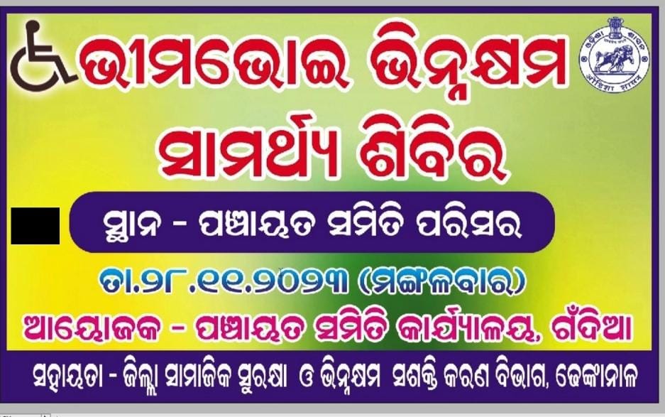 ଭୀମଭୋଇ ଭିନ୍ନକ୍ଷମ ଅଭିଯାନ ଶିବିର ଆସନ୍ତା ତା 28/11/2023 ପଞ୍ଚାୟତ ସମିତି କାଯ୍ୟଳୟ ଗଁଦିଆ ଠାରେ ସକାଳ ୯ ଘଟିକା ଠାରୁ ଅନୁଷ୍ଠିତ ହେବ ।